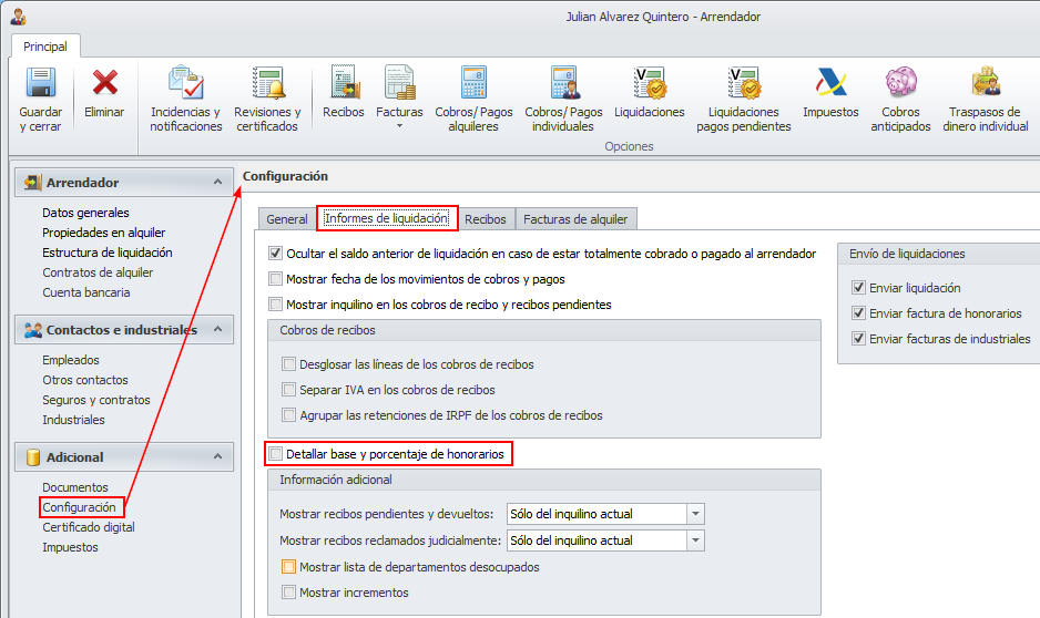 Para que la liquidación oculte la base y el porcentaje de honorarios, vaya a la sección Configuración de la ficha del arrendador y desactive la casilla Detallar base y porcentaje de honorarios. De este modo sólo se mostrará el texto indicado como Descripción en la línea de honorarios del grupo de liquidación (en el ejemplo anterior, Asesoramiento inmobiliario).