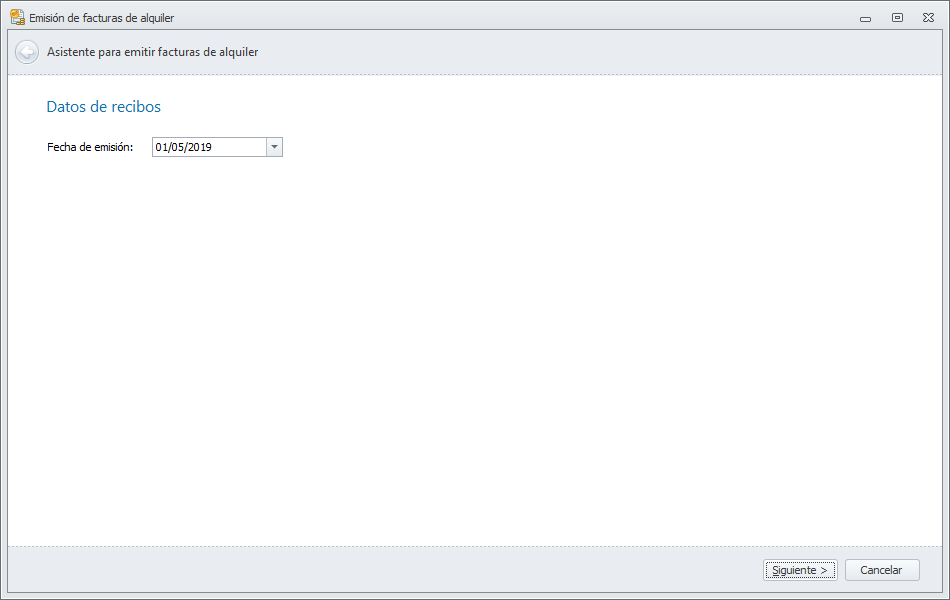 Al hacer clic en el botón Emitir facturas de alquiler, se abre el asistente que le guiará durante el proceso. Se solicita la fecha de emisión de las facturas.
