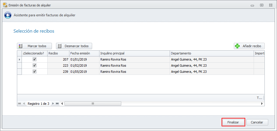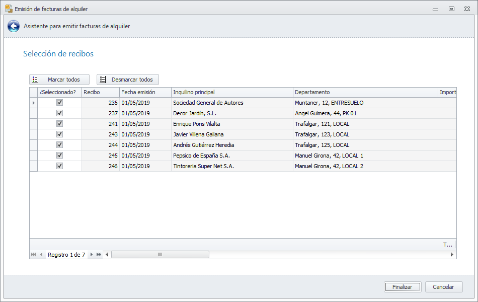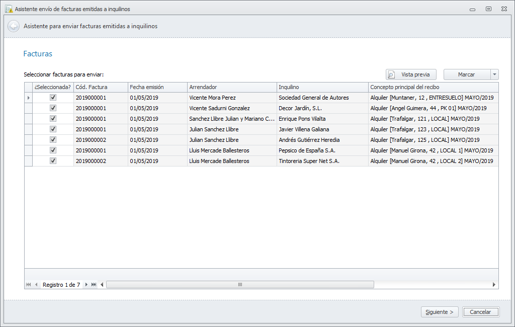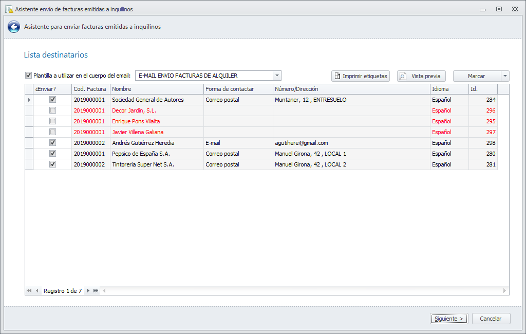 Este proceso remite a cada inquilino su factura, según la forma de envío escogida en su ficha de contacto, a través de un asistente cuya primera ventana muestra las facturas a enviar. Si desea no enviar alguna de ellas puede desmarcarla.