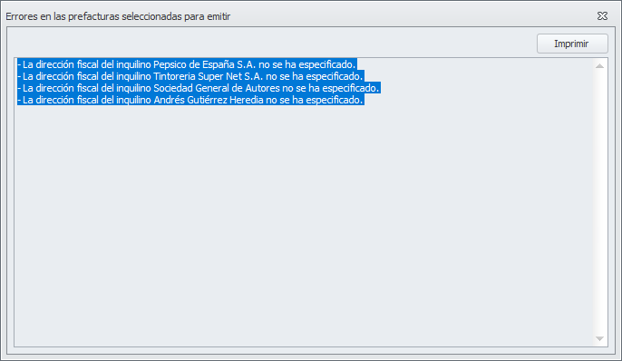 Al hacer clic en Finalizar adminet analiza la corrección de todos los datos para poder emitir las facturas. Si detecta incidencias las muestra en una ventana como la siguiente. En este caso debe cancelar el proceso, corregir las incidencias y volver a repetir la emisión de facturas de alquiler.