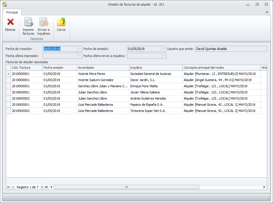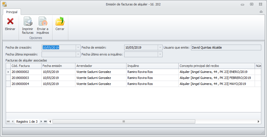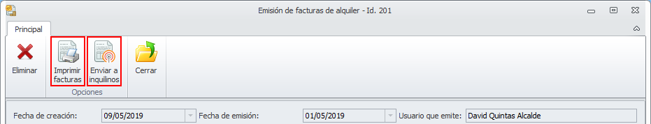 En la parte superior de la ventana dispone de botones que le permiten Imprimir facturas y Enviar a inquilinos.