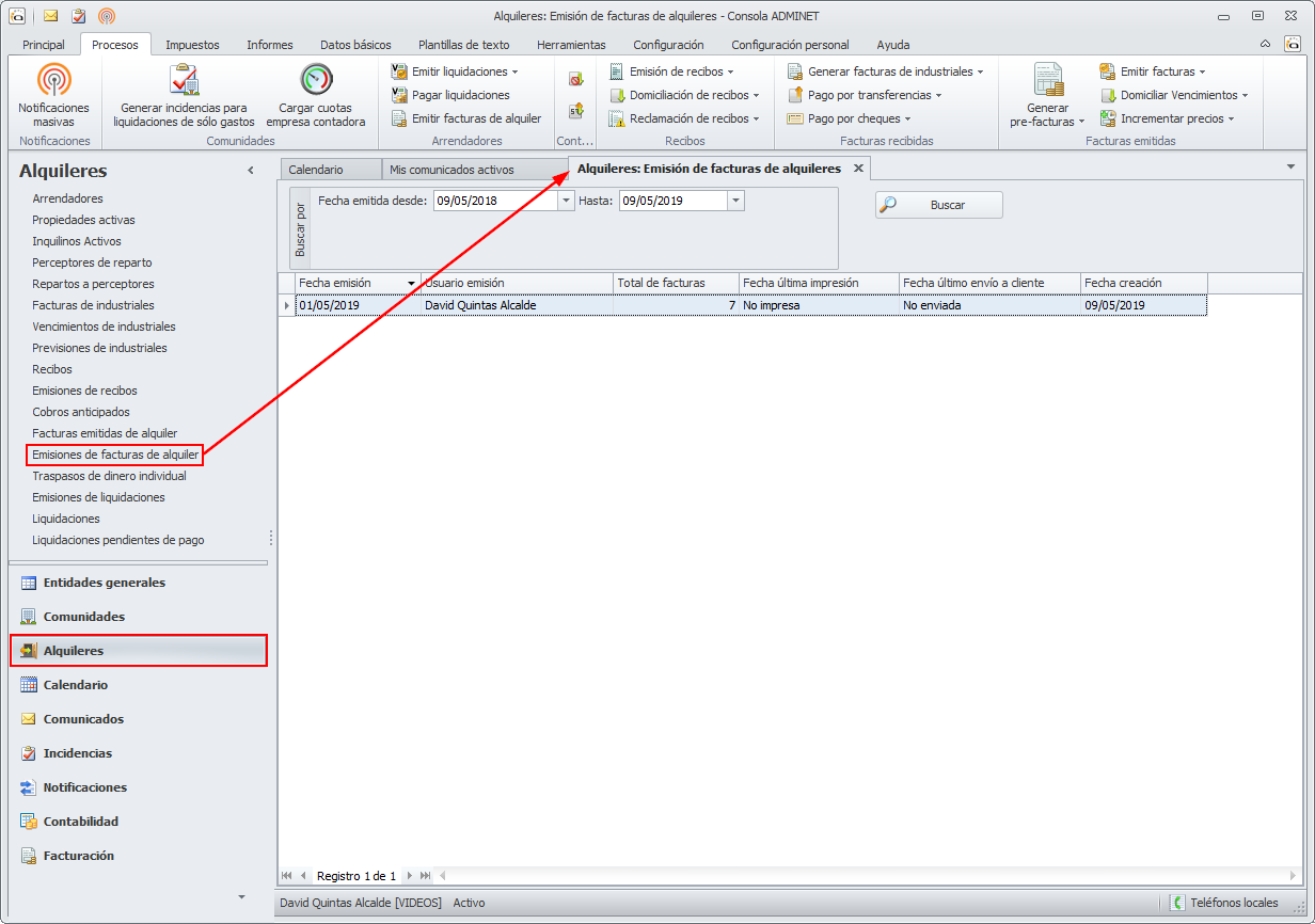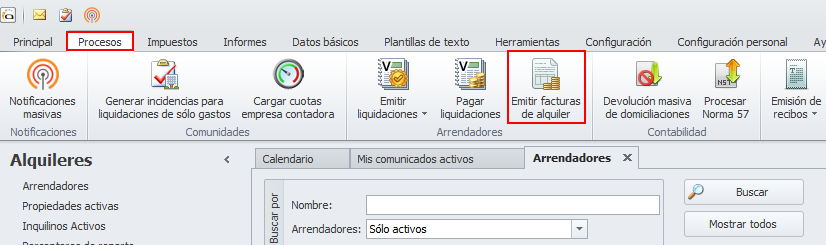 En este caso, para emitir las facturas de alquiler debe hacerlo desde el menú Procesos, accediendo a la opción Emitir facturas de alquiler.