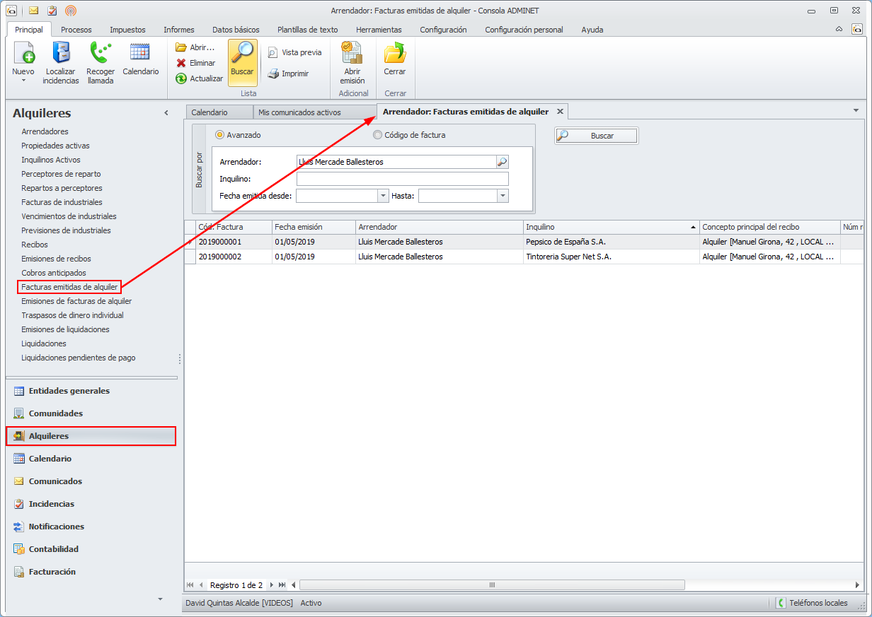 Se puede acceder a la lista de facturas emitidas de alquiler accediendo al apartado Alquileres y haciendo clic en la opción Facturas emitidas de alquiler.