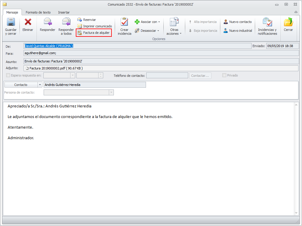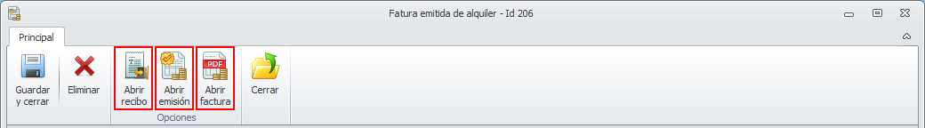 En la parte superior de la ventana tiene una cinta con botones que le permiten abrir el recibo que origina esta factura, abrir la emisión de facturas que contiene esta factura o visualizar el pdf correspondiente a la factura de alquiler.