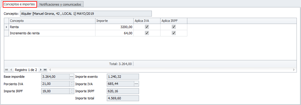 Más abajo, en la pestaña Conceptos e importes se pueden ver los datos económicos de la factura de alquiler.