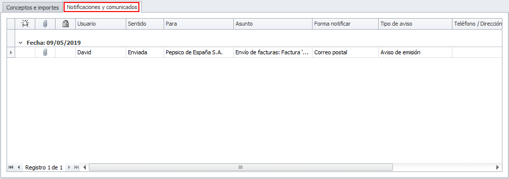 Y en la pestaña Notificaciones y comunicados, todas las comunicaciones realizadas desde esta factura.