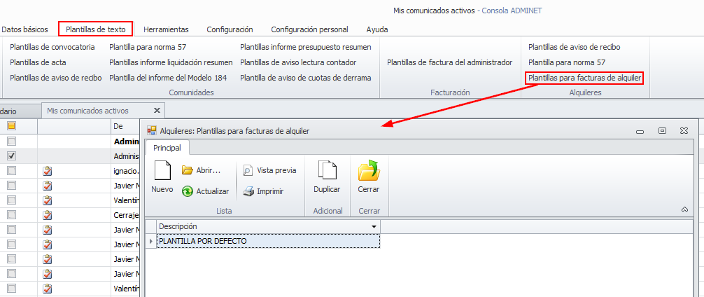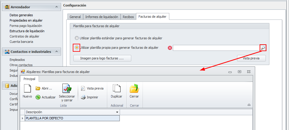 Como puede ver en la imagen, por defecto tiene configurado Utilizar plantilla estándar para generar facturas de alquiler. Si activa Utilizar plantilla propia para generar facturas de alquiler podrá acceder a la lista de plantillas para escoger otra e incluso crearla en ese momento.