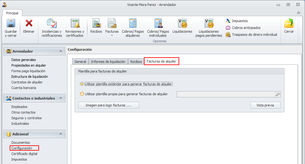 No obstante, si lo cree necesario, puede personalizar el diseño para algún arrendador, accediendo a la sección Configuración de su ficha y haciendo clic en la pestaña Facturas de alquiler.