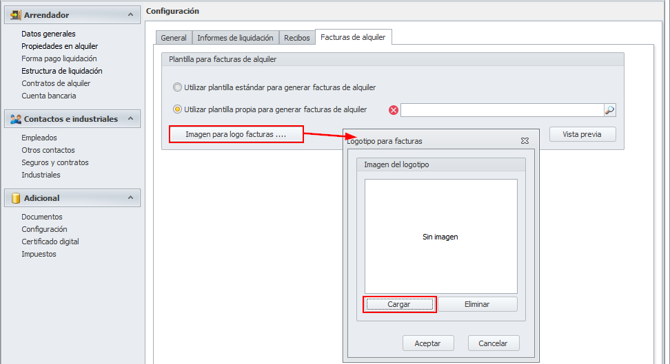 Sí desea que en lugar de aparecer los datos fiscales del arrendador en modo texto, se imprima un logo del mismo, haga clic en el botón Imagen para logo facturas... y se abrirá una ventana para que cargue el logo del arrendador.