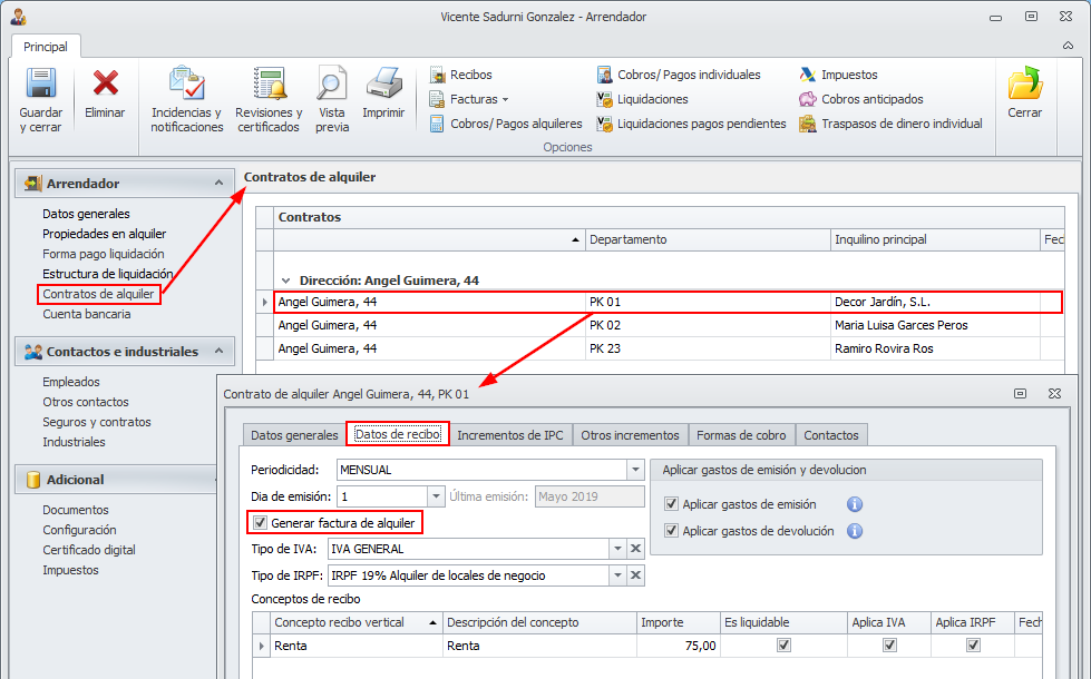 Para aquellos inquilinos que soliciten recibir la factura de alquiler, deberá acceder a su contrato de alquiler y activar en la pestaña Datos recibo la casilla Generar factura de alquiler.
