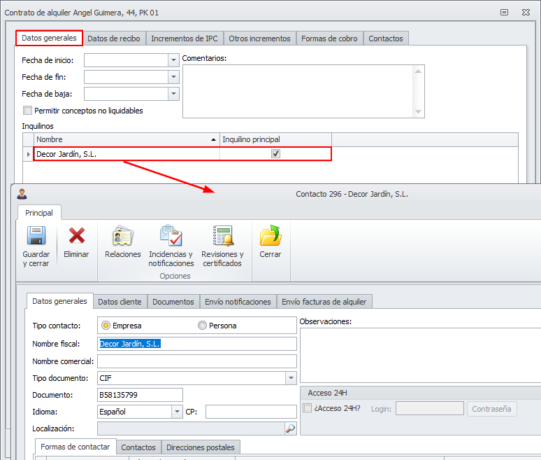 Además deberá acceder a la ficha de contacto del inquilino para rellenar aquella información que sea necesaria. Esta información la puede ver en el siguiente apartado.