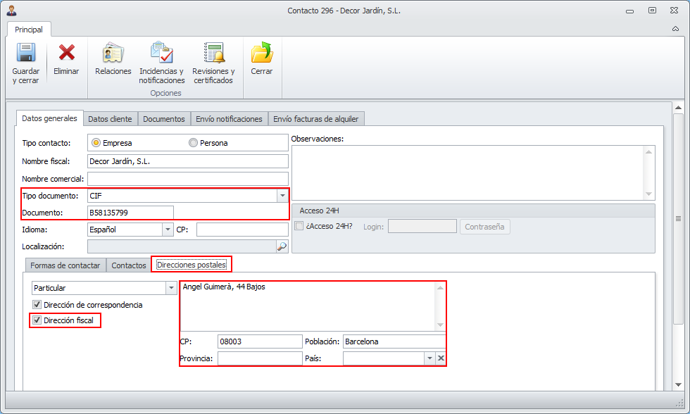 Para poder emitir facturas de alquiler a un contacto, es necesario que tenga registrado su DNI o CIF y su dirección fiscal.