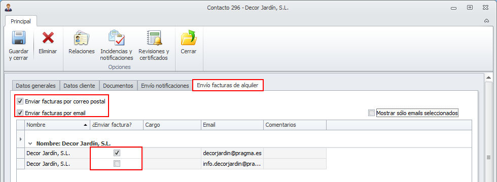 Además, en la pestaña Envío facturas de alquiler (que sólo es visible si el contacto forma parte de algún contrato de alquiler al que se deba emitir factura) debe indicar cómo se le remitirán las facturas de alquiler.