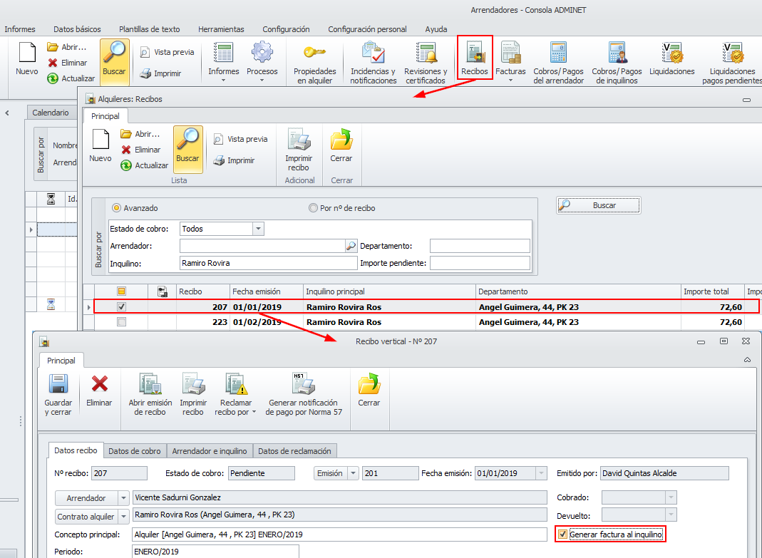 Emitir facturas a un inquilino de recibos emitidos con anterioridad