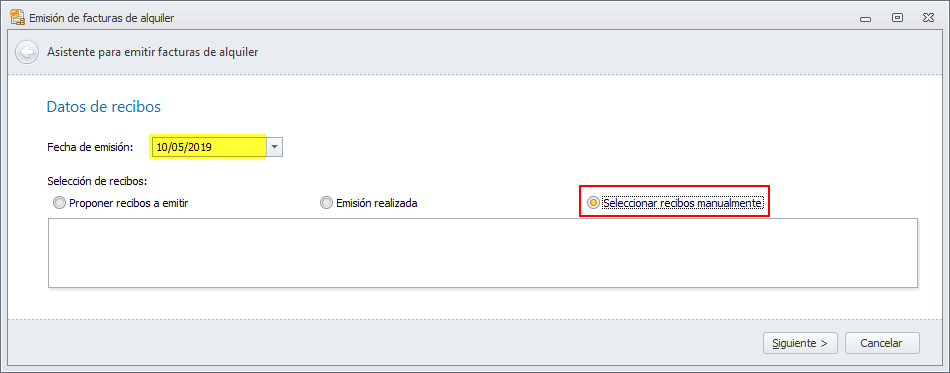 Se abrirá el asistente. Deberá indicar la fecha de emisión de las facturas. Tenga en cuenta la fecha de la última factura emitida para el arrendador, ya que no puede ser anterior a esa.