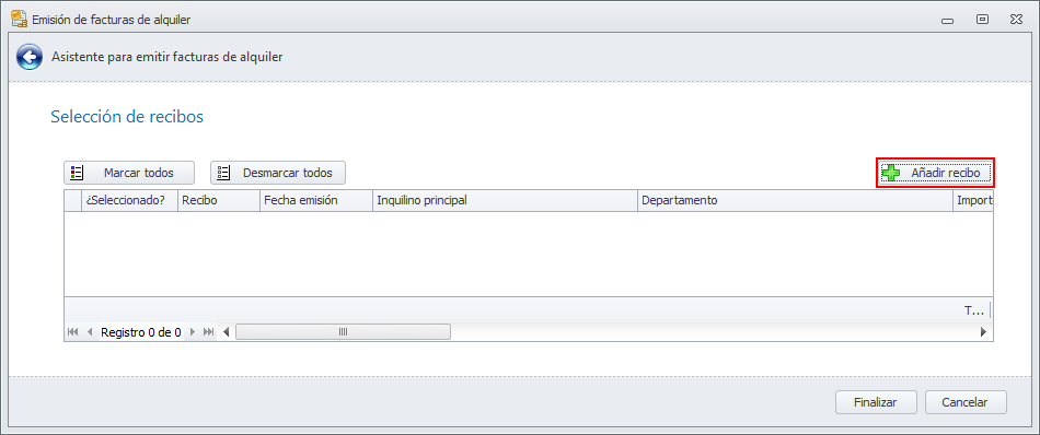 Ahora debe ir añadiendo los recibos a los que anteriormente ha activado la casilla Emitir factura de alquiler. haga clic en Añadir recibo.