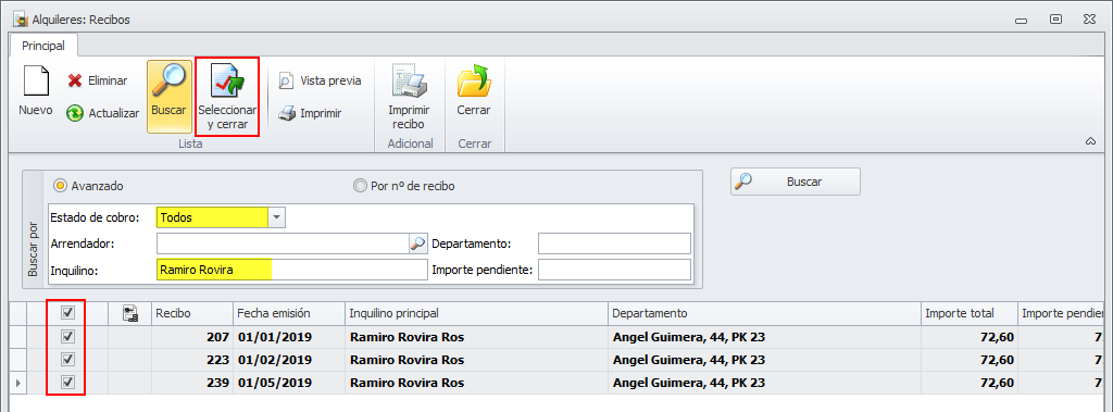 Una vez localizados los recibos, escoja los que necesite y haga clic en Seleccionar y cerrar.