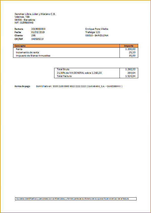 Las facturas de alquiler tienen, por defecto, el mismo diseño para todos los arrendadores. Ese diseño es el establecido en la Plantilla por defecto comentada en el apartado anterior.