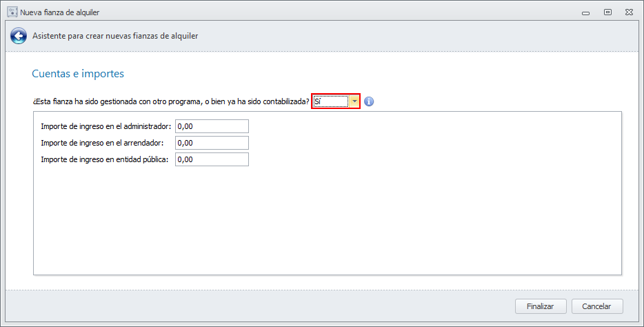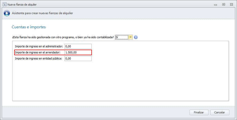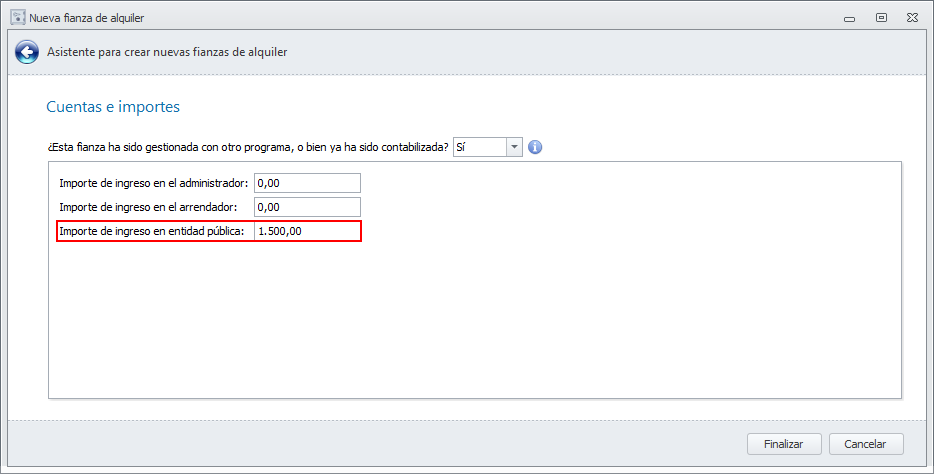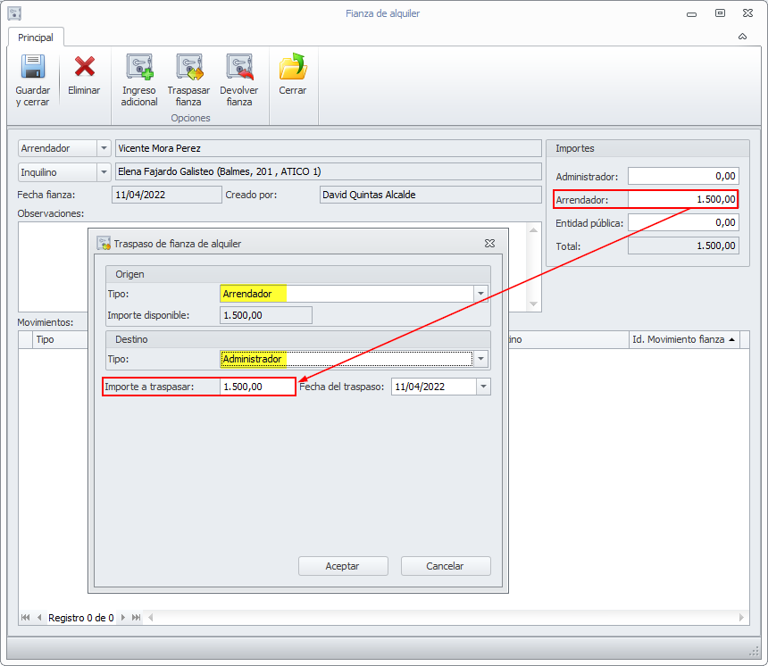 Si el ingreso en la entidad pública lo va a realizar usted, tras dar de alta la fianza en los términos indicados, debe efectuar una operación Traspasar fianza de arrendador a administrador.
