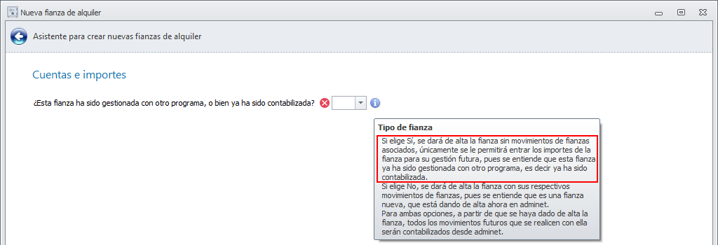 El icono que se encuentra a la derecha de la casilla explica que al elegir “Sí” se da de alta la fianza sin generar movimientos asociados y sin contabilizar nada.