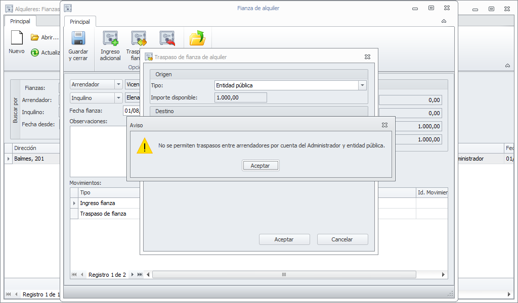 Si un arrendador se gestiona con cuenta bancaria del administrador adminet no permite registrar un traspaso de fianza directa de la entidad pública al arrendador. Si lo intenta se muestra un mensaje diciendo: No se permiten traspasos entre arrendadores por cuenta del administrador y entidad pública.