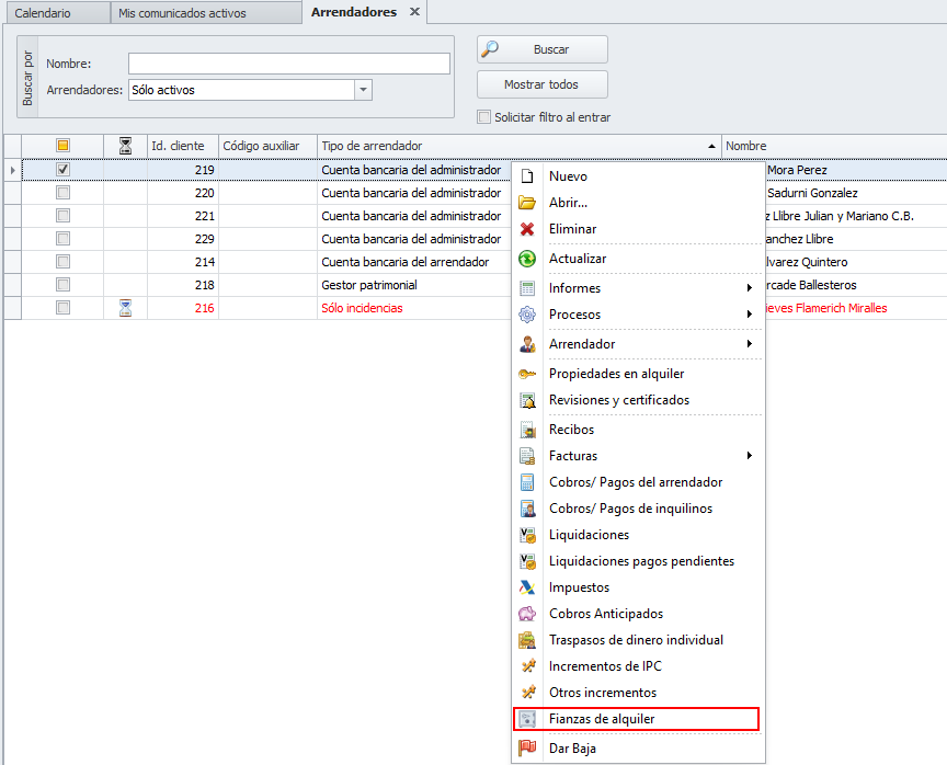 Para acceder a las fianzas de un arrendador puede hacer clic derecho sobre el mismo y escoger la opción Fianzas de alquiler.