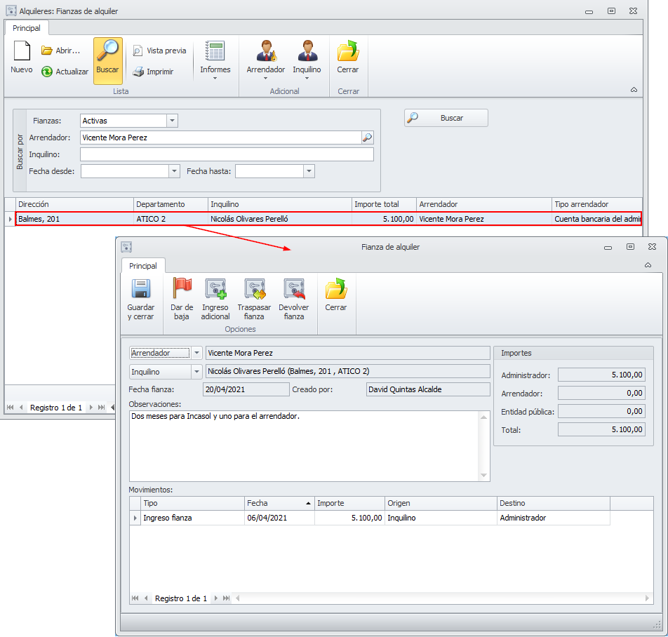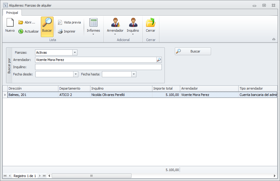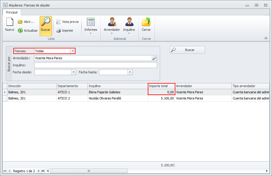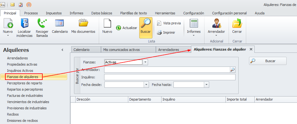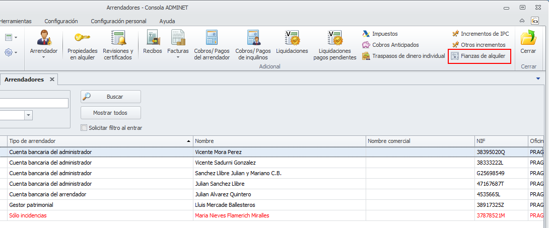 También puede acceder, desde la misma lista de arrendadores, haciendo clic en el botón Fianzas del menú Principal.