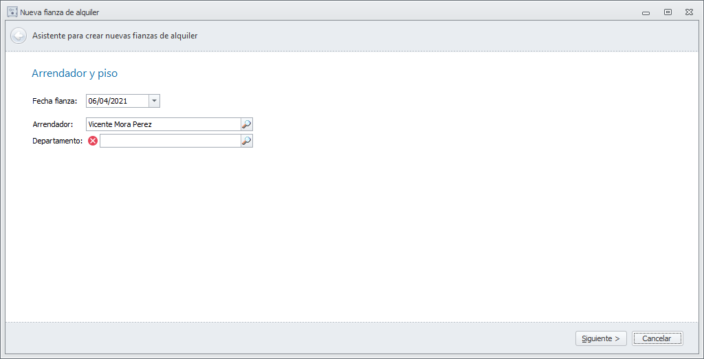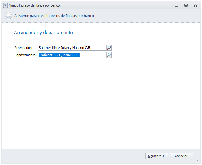La siguiente ventana permite ajustar la fecha y el importe de la fianza. Por defecto ofrece el importe del movimiento, pero puede modificarse. Puede darse el caso de que el movimiento bancario sea por la suma de la fianza, el primer alquiler y los honorarios del administrador.