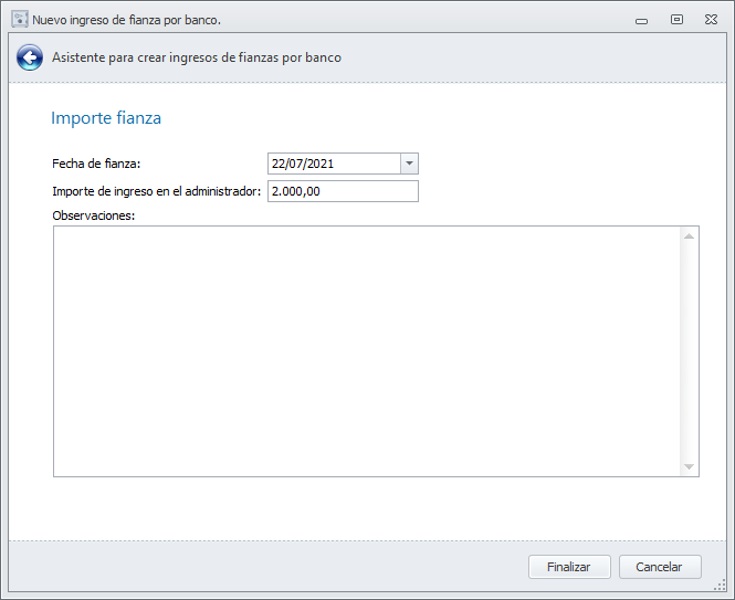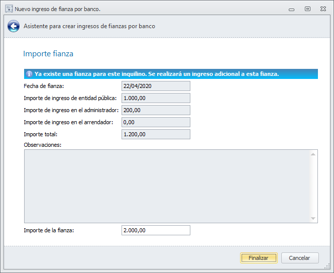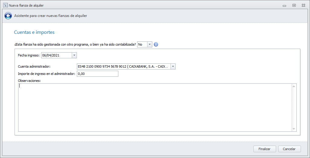 Si responde que sí, se añadirá la ficha de la fianza con los datos que indique, sin realizar ningún movimiento contable.
