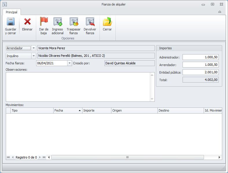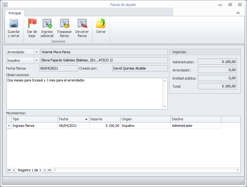 La fianza ha sido creada y se muestra por si desea continuar trabajando con ella. Por ejemplo, añadir observaciones o realizar operaciones de traspaso, devolución o ingreso adicional.