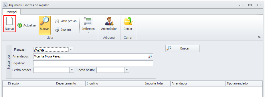 Para añadir una nueva fianza, sitúese en la vista de fianzas del arrendador y haga clic en el botón Nuevo.