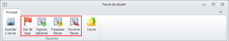La ficha de la fianza incorpora tres botones que permiten registrar las distintas operaciones que se realizan con la misma.
