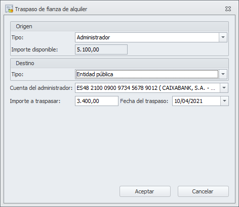 Muestra la siguiente ventana, en la que debe indicar el origen y destino y el importe traspasado. Siempre que participa el administrador, se debe indicar la cuenta bancaria en la que se debe registrar la operación.