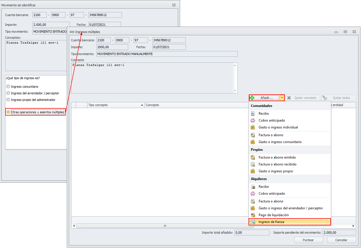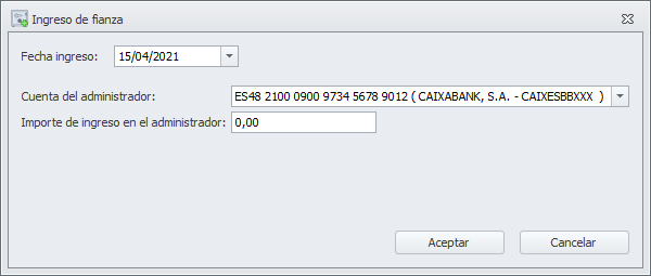 Junto con el movimiento de constitución de la fianza, es una operación de entrega de dinero por parte del inquilino. Se debe indicar la cuenta bancaria en la que se debe registrar la operación y el importe recibido.