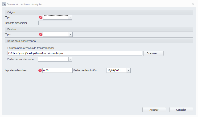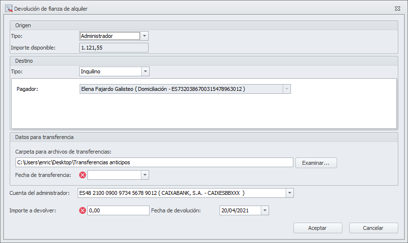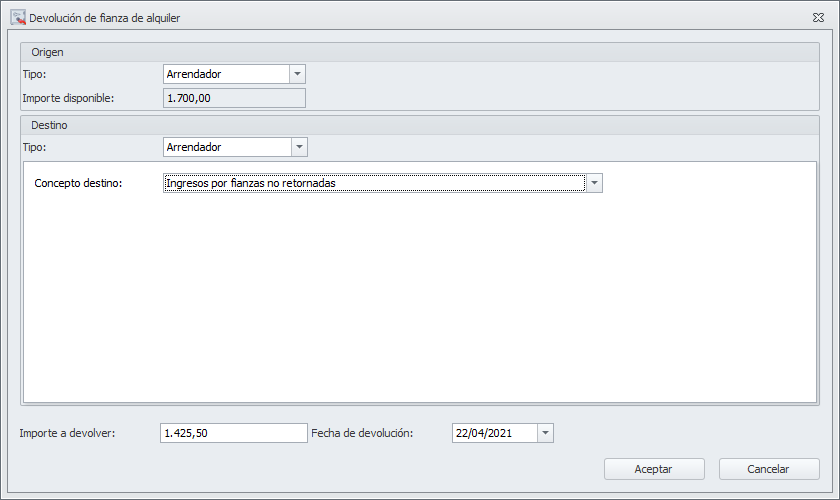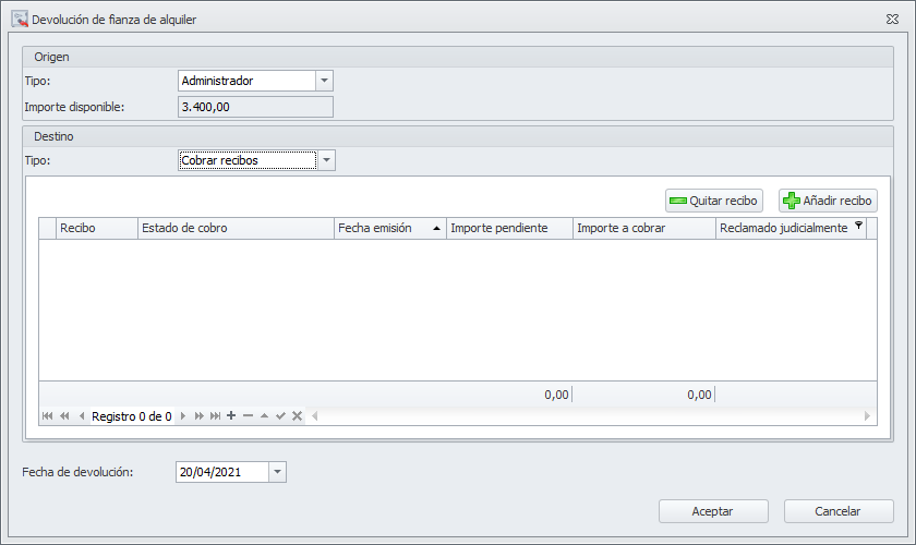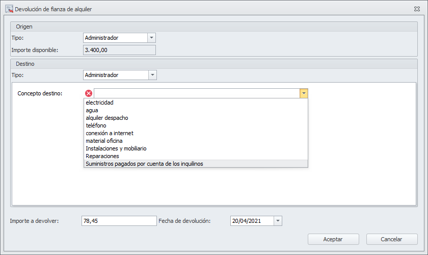 Con esta operación se registra la devolución del importe de la fianza. Como origen podrán operar el administrador o el arrendador. Como destino pueden ser: