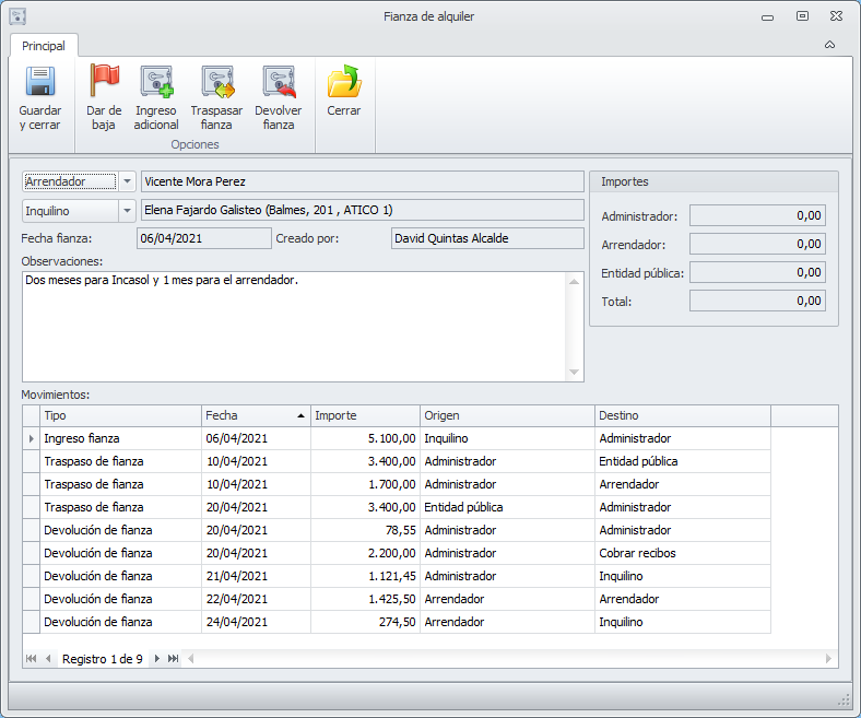 Movimientos: Lista de operaciones económicas relacionadas con esta fianza. El conjunto de etas operaciones da como resultado los importes de administrador, arrendador y entidad pública.