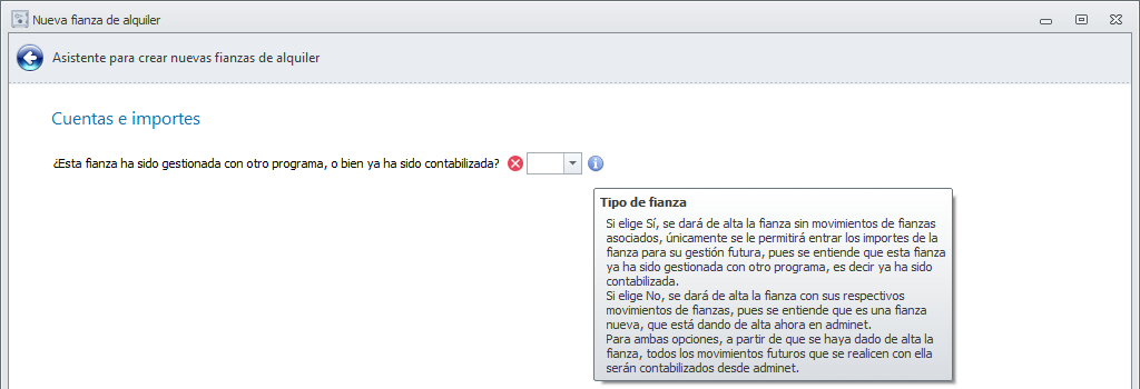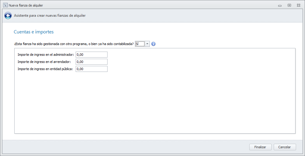 A continuación, se pregunta si la fianza fue gestionada con otro programa o si ya ha sido contabilizada.