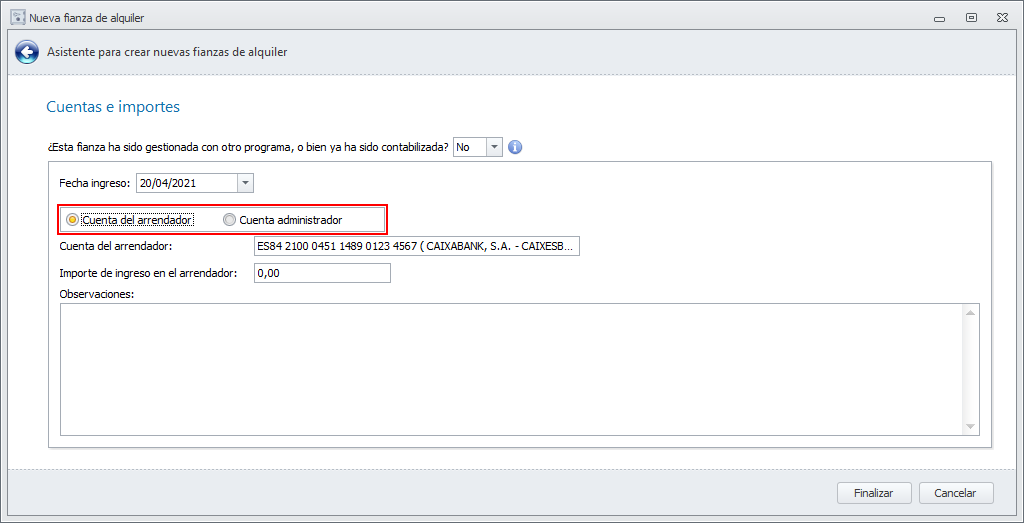 Si el arrendador se administra con cuenta bancaria de arrendador o si es un gestor patrimonial, la ventana incluye la posibilidad de indicar si la fianza se ha cobrado en una cuenta del arrendador o del administrador.