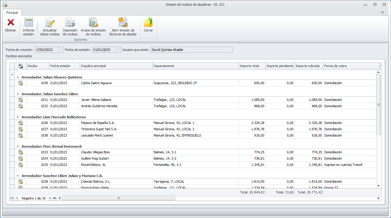 La emisión de recibos de alquiler agrupa todos los recibos bajo una ficha de emisión desde la que se pueden ejecutar todos los procesos vinculados a esa emisión. Al finalizar el proceso de emisión de recibos, Adminet deja abierta la ficha de esa emisión, que tiene el siguiente aspecto.
