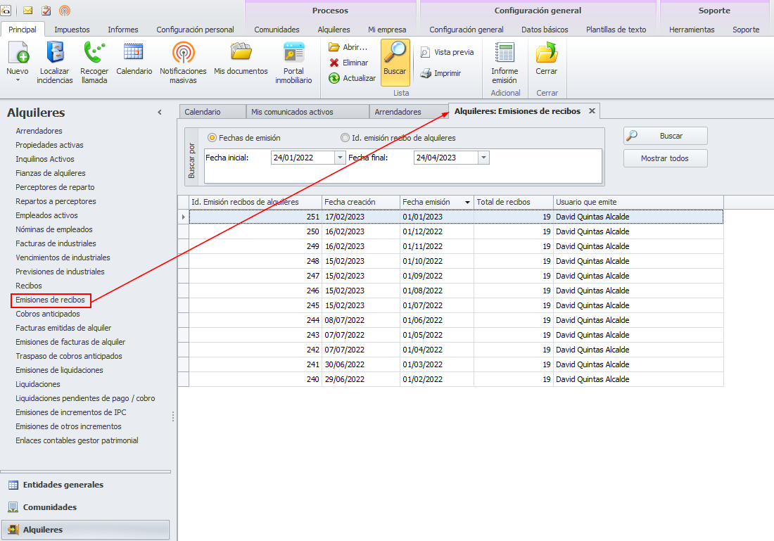También se puede acceder a una emisión desde las opciones del apartado de Alquileres.