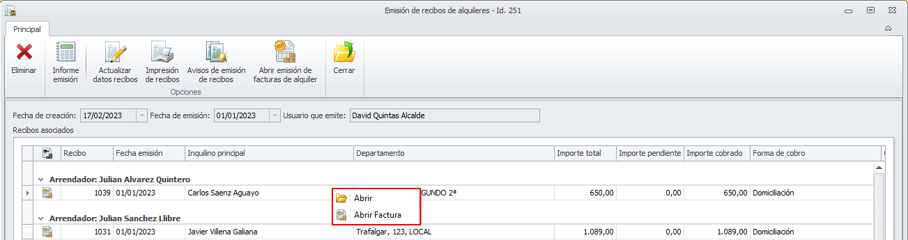 Con clic derecho sobre cualquiera de las líneas correspondientes a los recibos, puede abrirse la ficha de dicho recibo. También puede accederse a la ficha de la factura de alquiler, en caso de haberse ya generado.