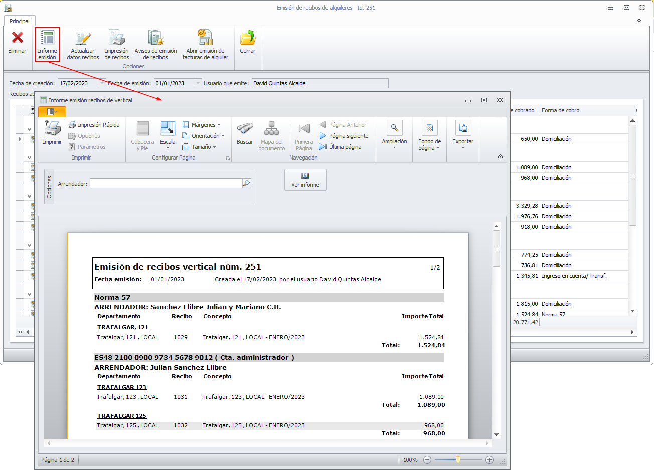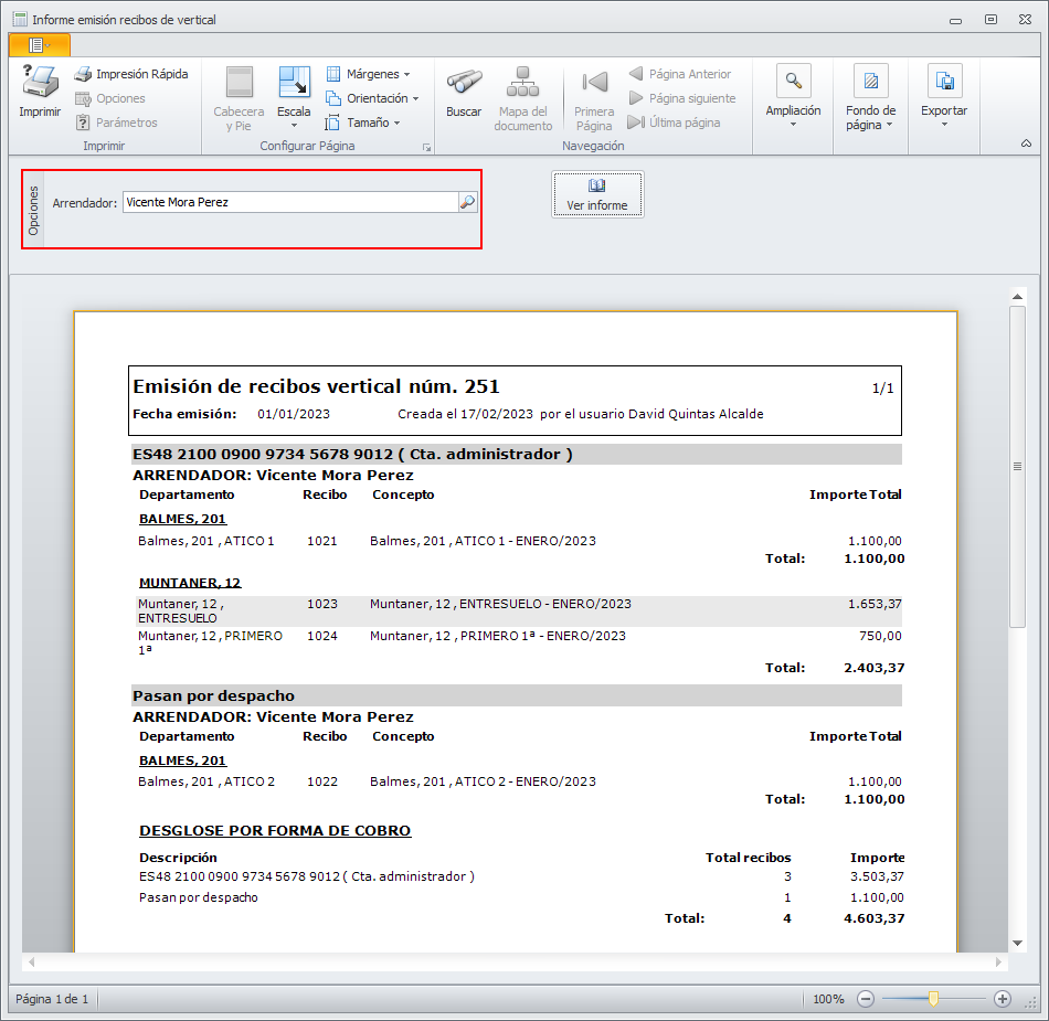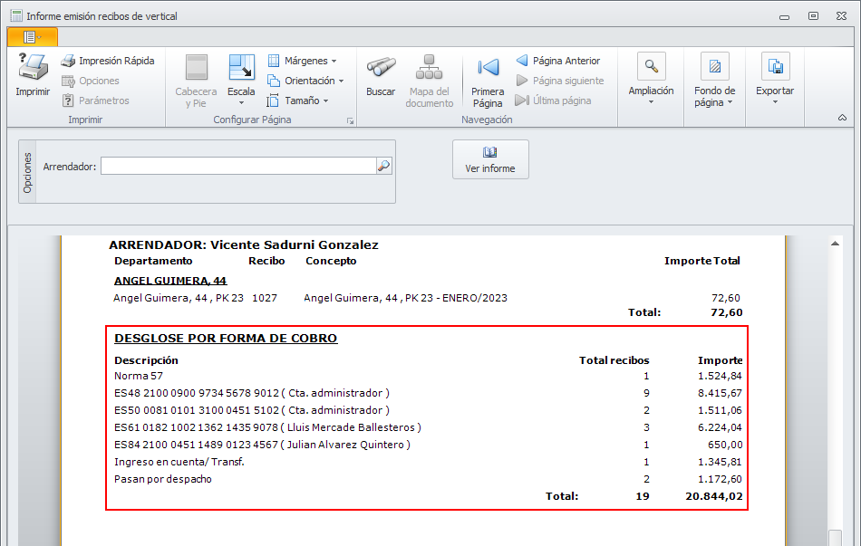 Al informe de emisión de recibos se accede desde la ficha de emisión. Si no selecciona ningún arrendador, se muestra el informe completo de la emisión. Se agrupan los recibos por forma de cobro, arrendador y dirección.