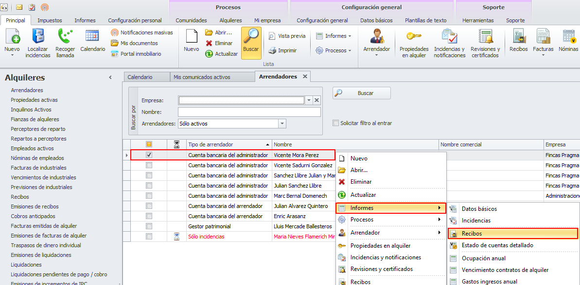 Se puede acceder al estado de cuentas detallado haciendo clic derecho sobre el arrendador o perceptor.