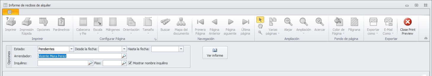 Arrendador. Puede seleccionar un arrendador concreto. Si deja esta casilla vacía, mostrará los recibos de todos los arrendadores, que cumplan el resto de condiciones.