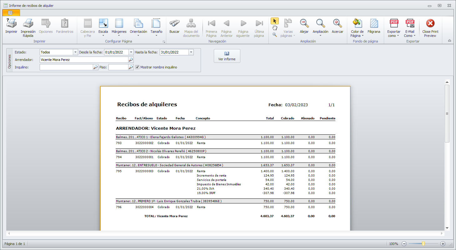 Este informe permite obtener, de forma rápida, una relación de recibos emitidos a inquilinos, detallando los conceptos que los componen. Sus opciones de filtrado permiten adaptarlo a cada necesidad de análisis concreta.