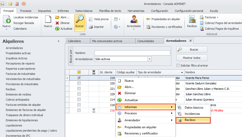Se puede acceder a esta opción haciendo clic derecho sobre la lista de arrendadores, y escogiendo la opción Informes->Recibos.