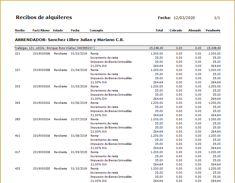 Este informe muestra los recibos emitidos de un arrendador, indicando, en diferentes columnas, los importes cobrados y pendientes de cada uno de ellos.