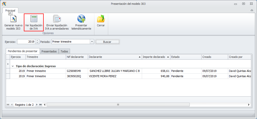 El informe Liquidación de IVA se genera en el mismo momento en que se genera el modelo 303. Se puede acceder a él desde el botón Ver liquidación de IVA de la ficha del modelo 303.