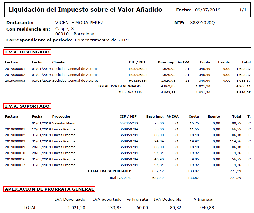 Muestra la suma las cuotas de IVA devengado y soportado. A partir del porcentaje de prorrata final del ejercicio anterior calcula el importe deducible (IVA soportado X %Prorrata / 100) y el importe a ingresar (IVA repercutido - IVA deducible).