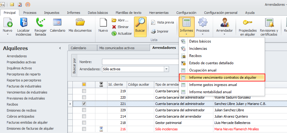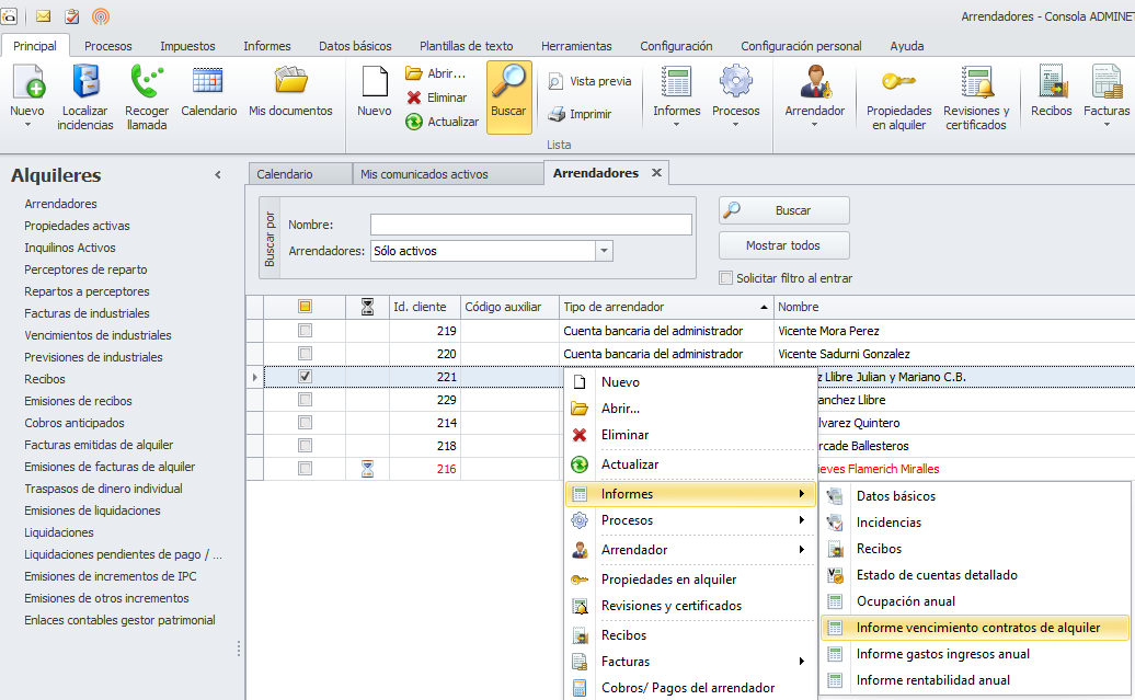 Se accede a él haciendo clic derecho sobre el arrendador y escogiendo Informes -> Informe vencimiento contratos de alquiler.